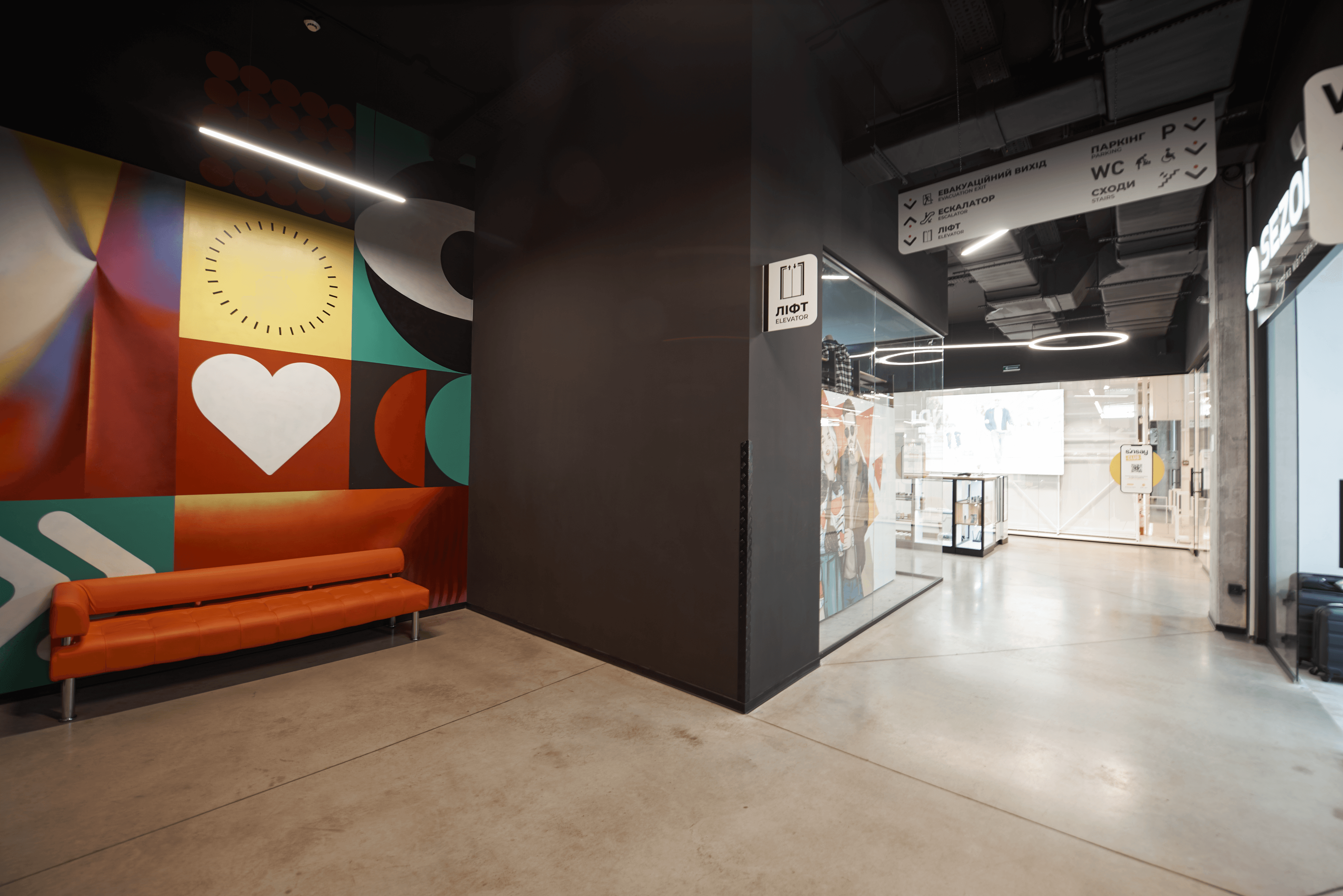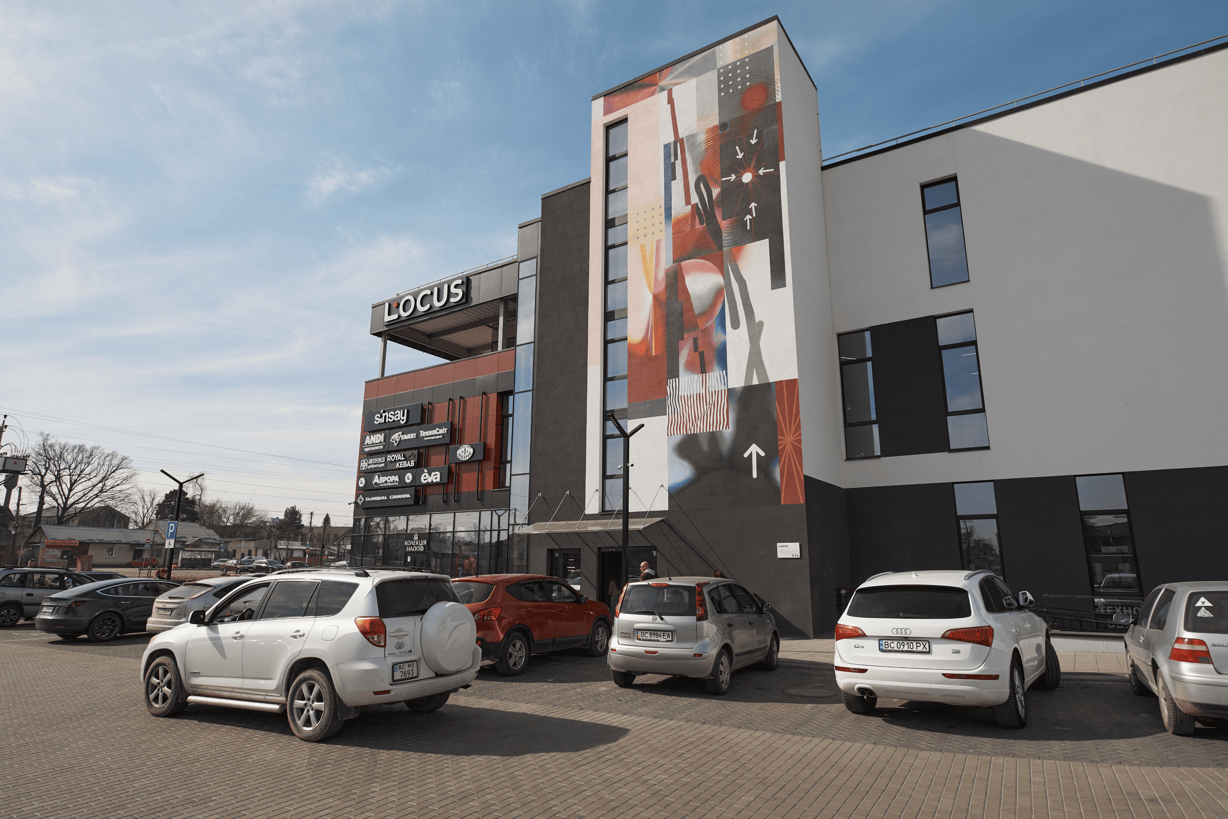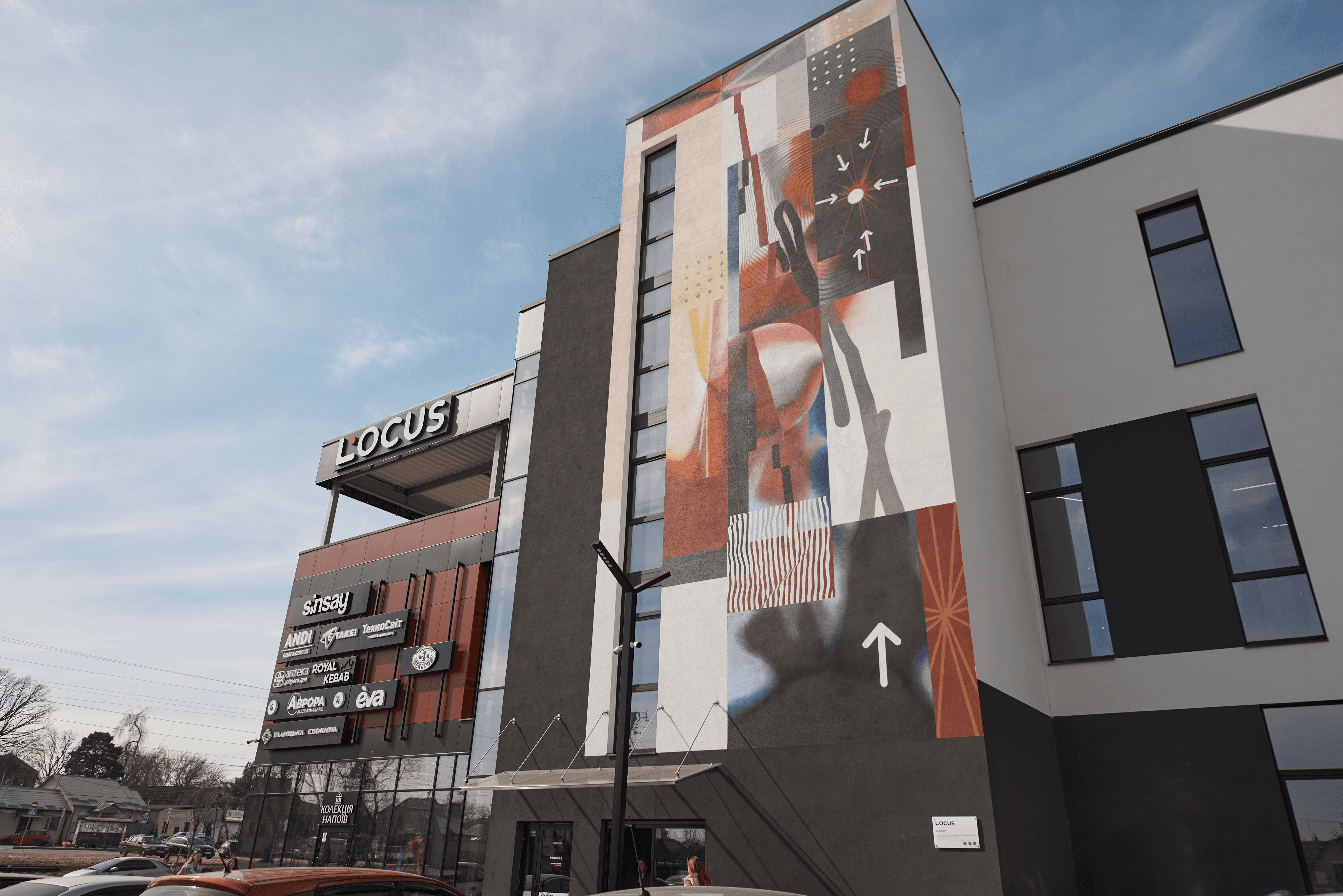 Футуристична композиція на фасаді ТЦ Locus стала яскравим акцентом простору. Динамічні форми створюють метафоричну подорож до центру тяжіння, який кожен глядач визначає для себе.