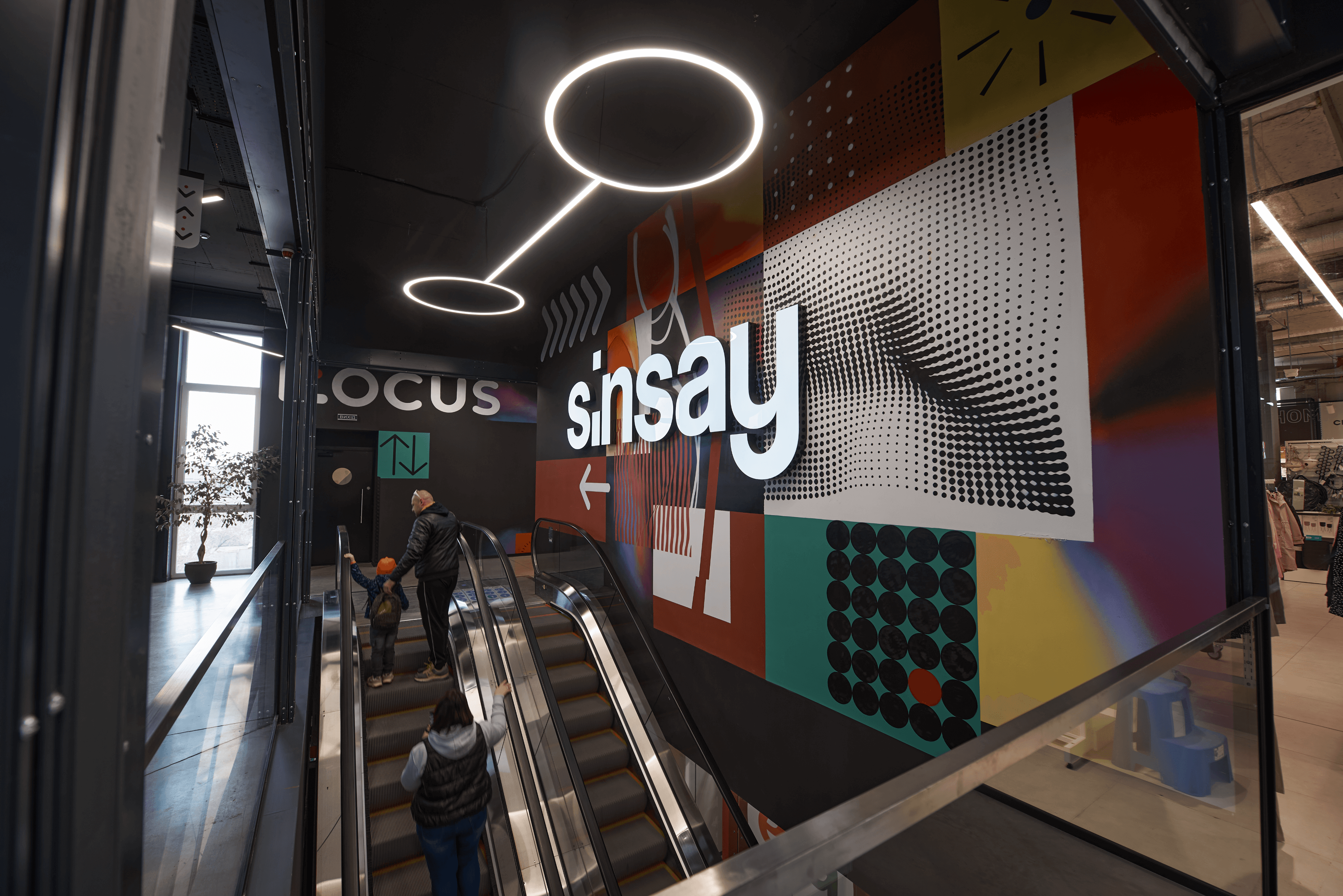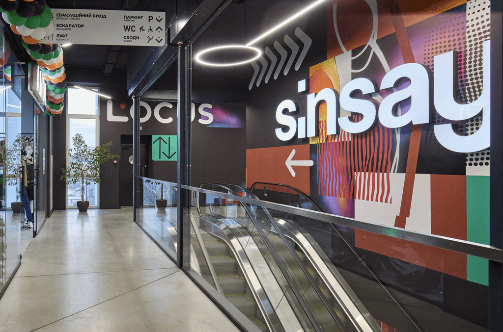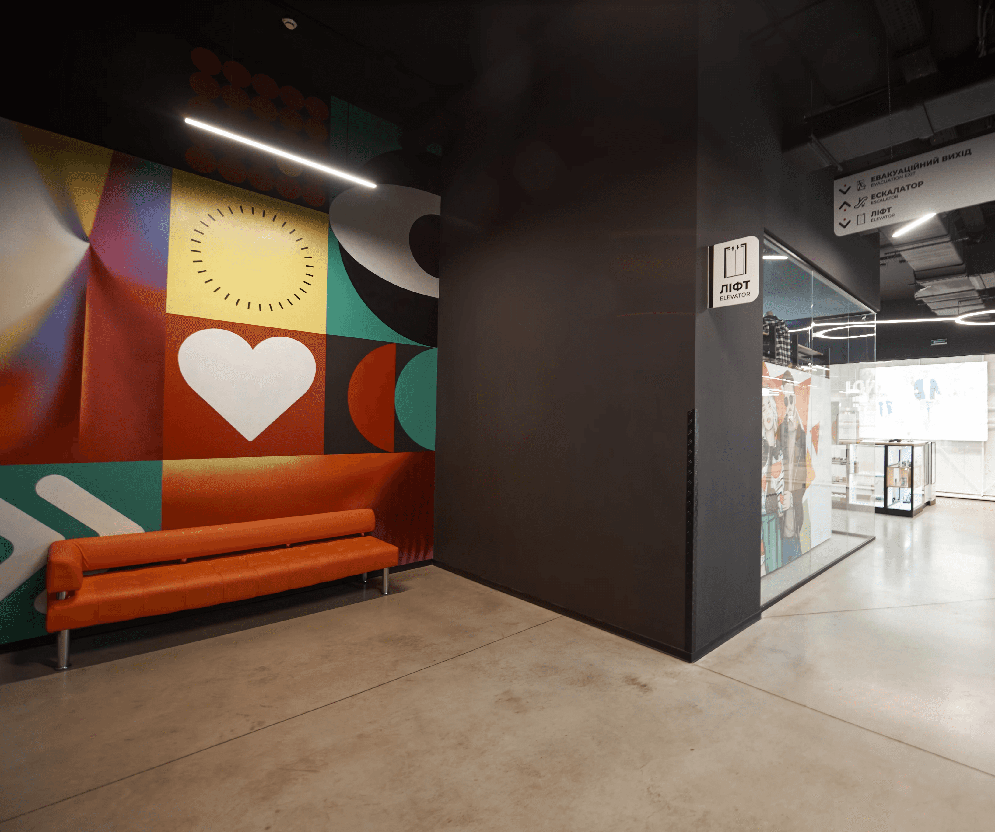 Футуристична композиція на фасаді ТЦ Locus стала яскравим акцентом простору. Динамічні форми створюють метафоричну подорож до центру тяжіння, який кожен глядач визначає для себе.