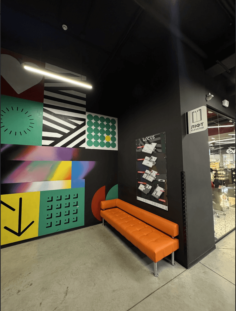 Мурал поєднує брендинг Locus, авторську пост-графіті стилістику та сучасний дизайн, досягаючи ефекту руху й простору навколо головної точки притягання.